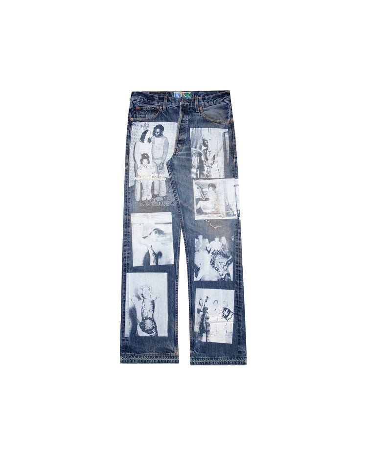 Presented on hand-picked vintage Levi’s 501, featuring printed and embroidered details.